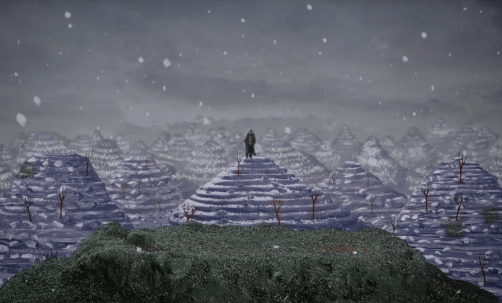 The film then depicts the troupe’s story in an extended animated sequence, essentially an outline of a “hero’s journey” — in which a father spends his entire life looking for his family after a flood separates them.